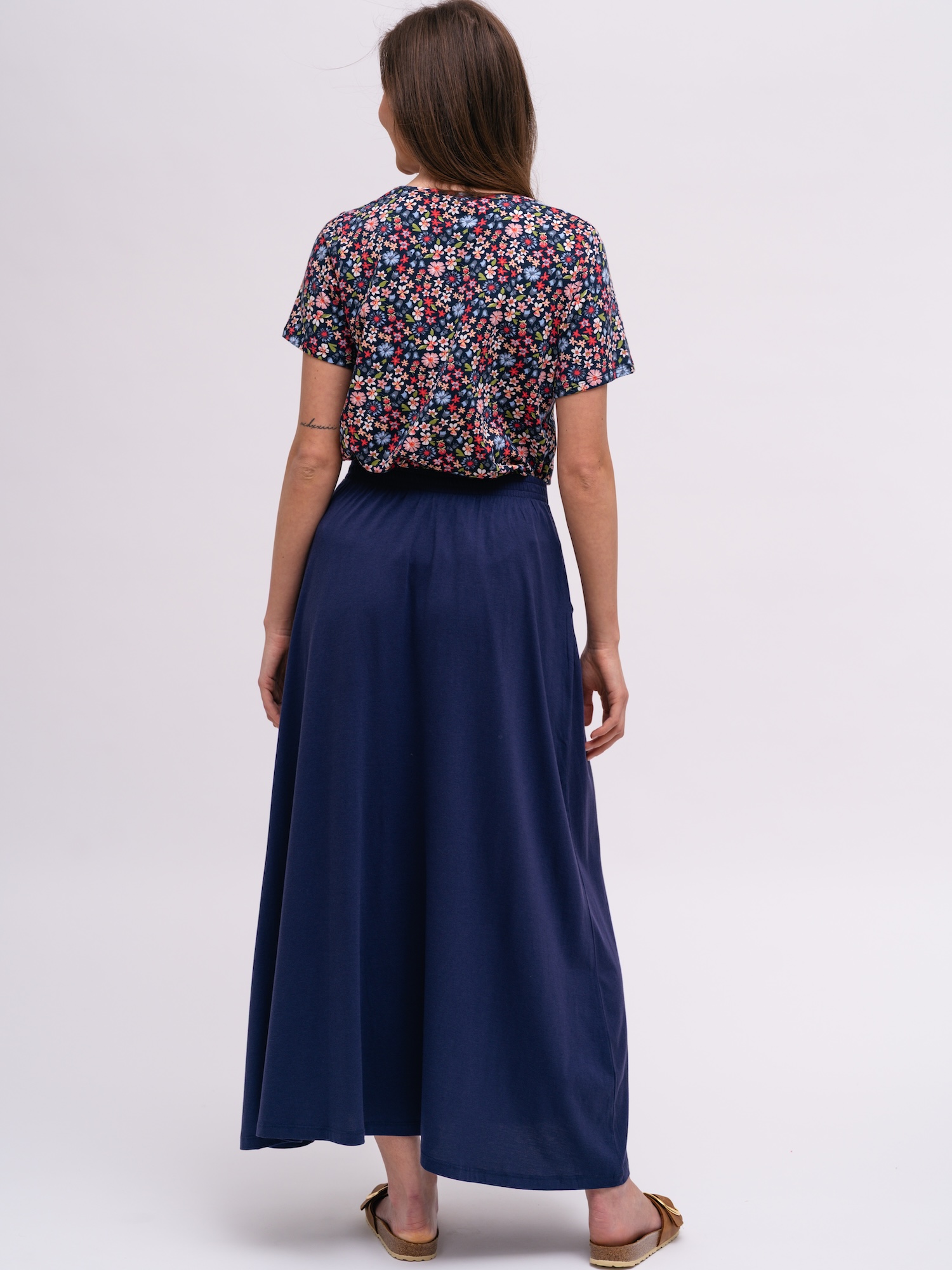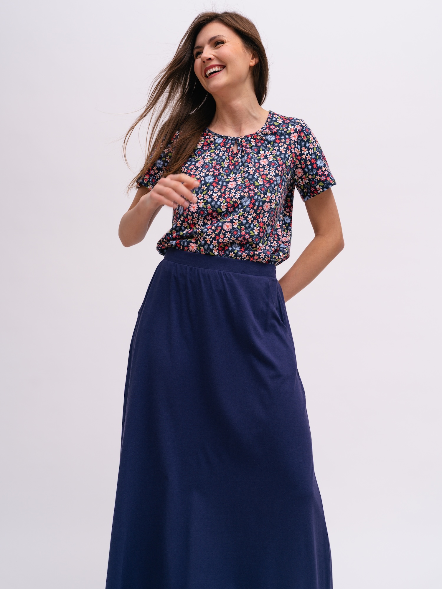 Áčková sukňa v námorníckej modrej pôsobí nenútene štýlovo. Hodí sa na prechádzky, kávu alebo víkendové chvíle v meste.