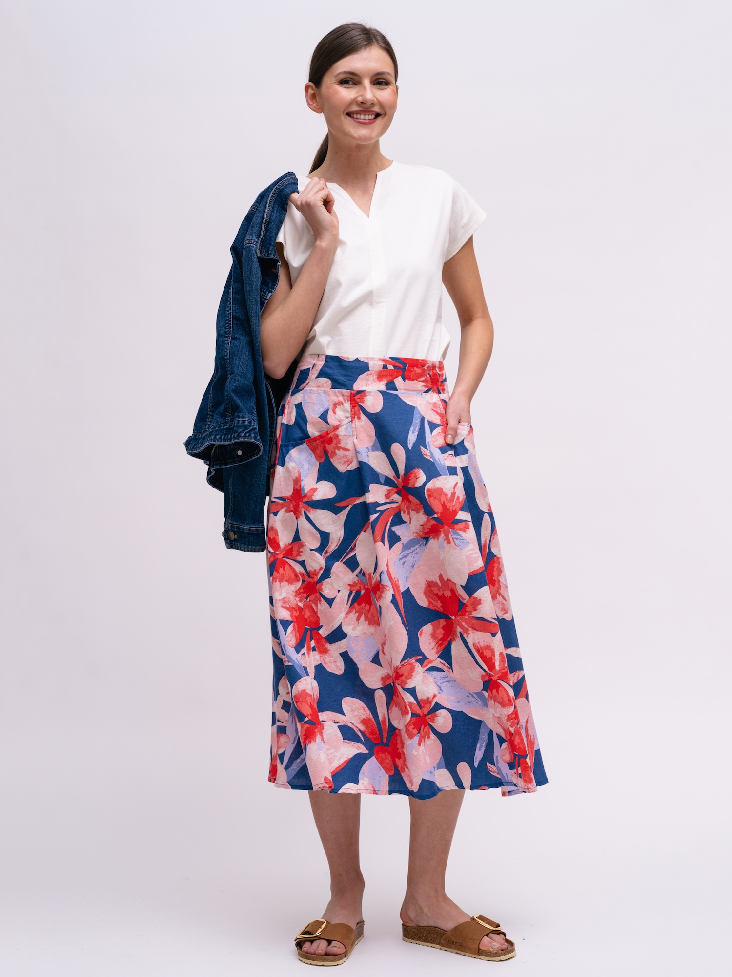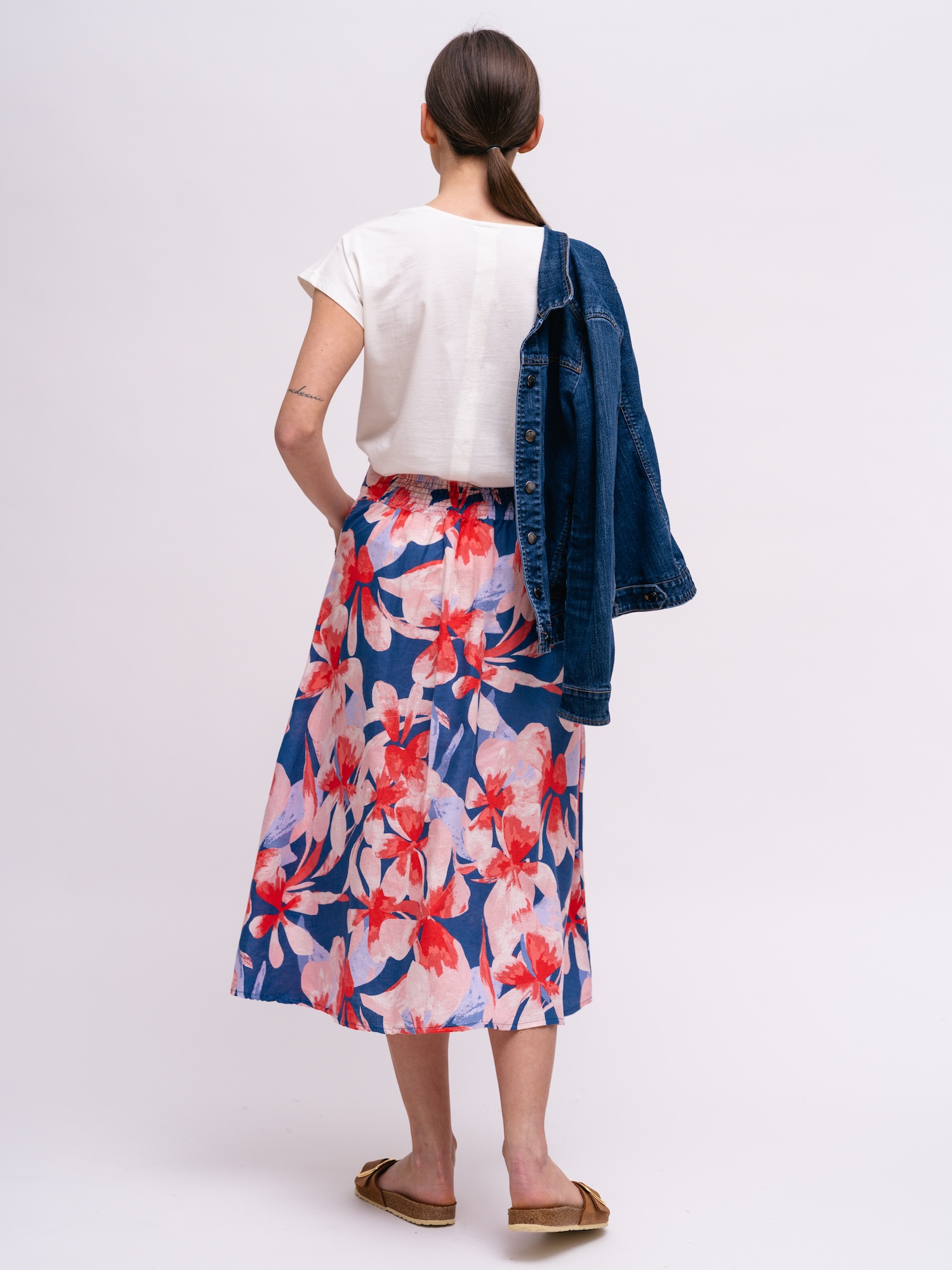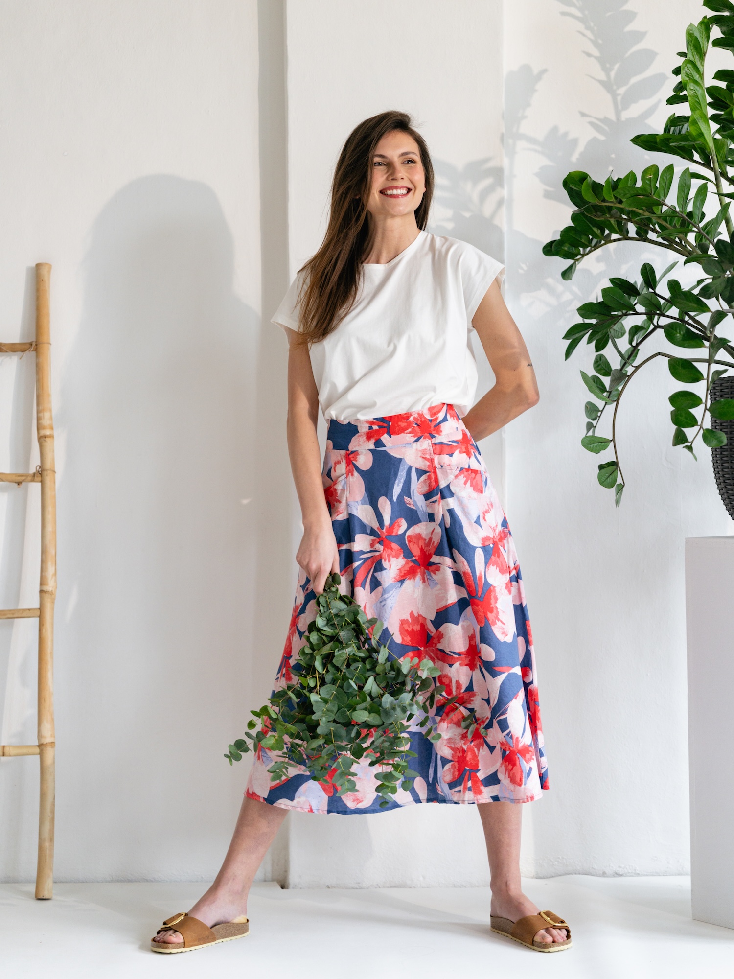 Na prechádzku aj letný brunch sa hodí kvetinová midi sukňa v jemnom áčkovom strihu. Farebná potlač na zmesi ľanu a organickej bavlny dodáva výrazný, no prirodzený akcent.