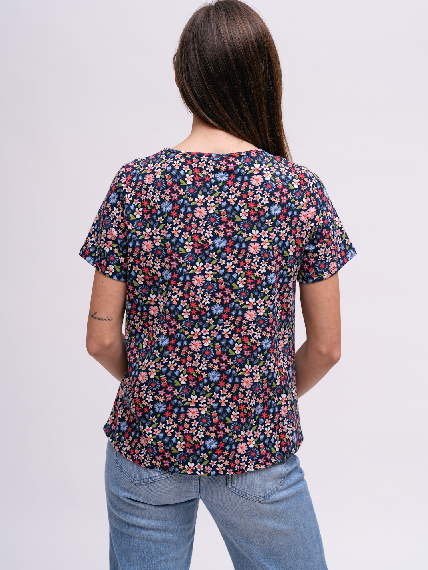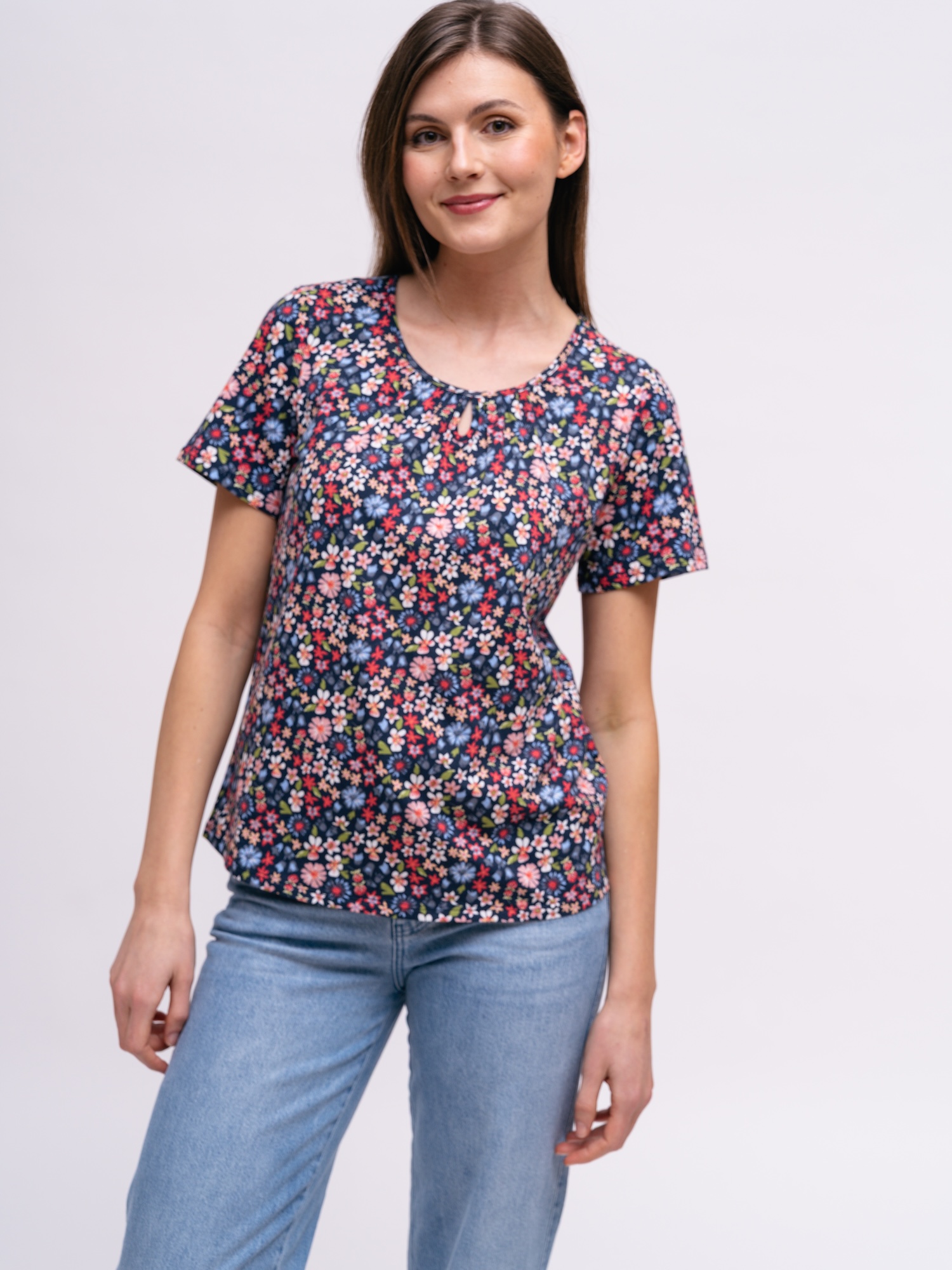 Farebná lúčna potlač oživí jednoduchý šatník. Rovný strih je praktický na bežné dni aj voľný čas.