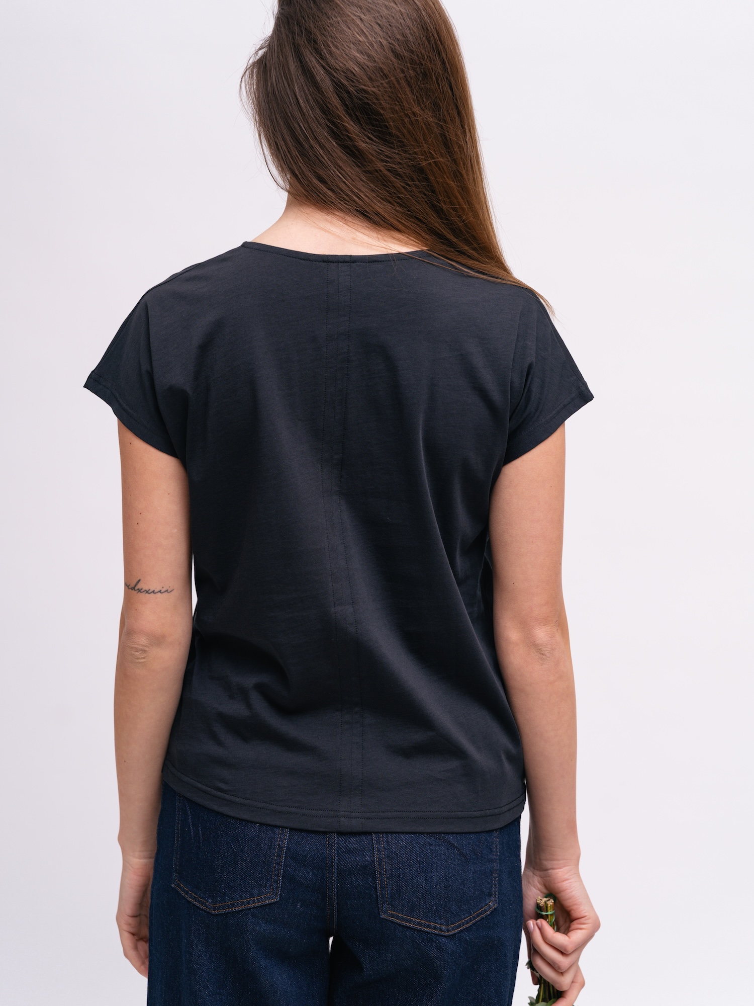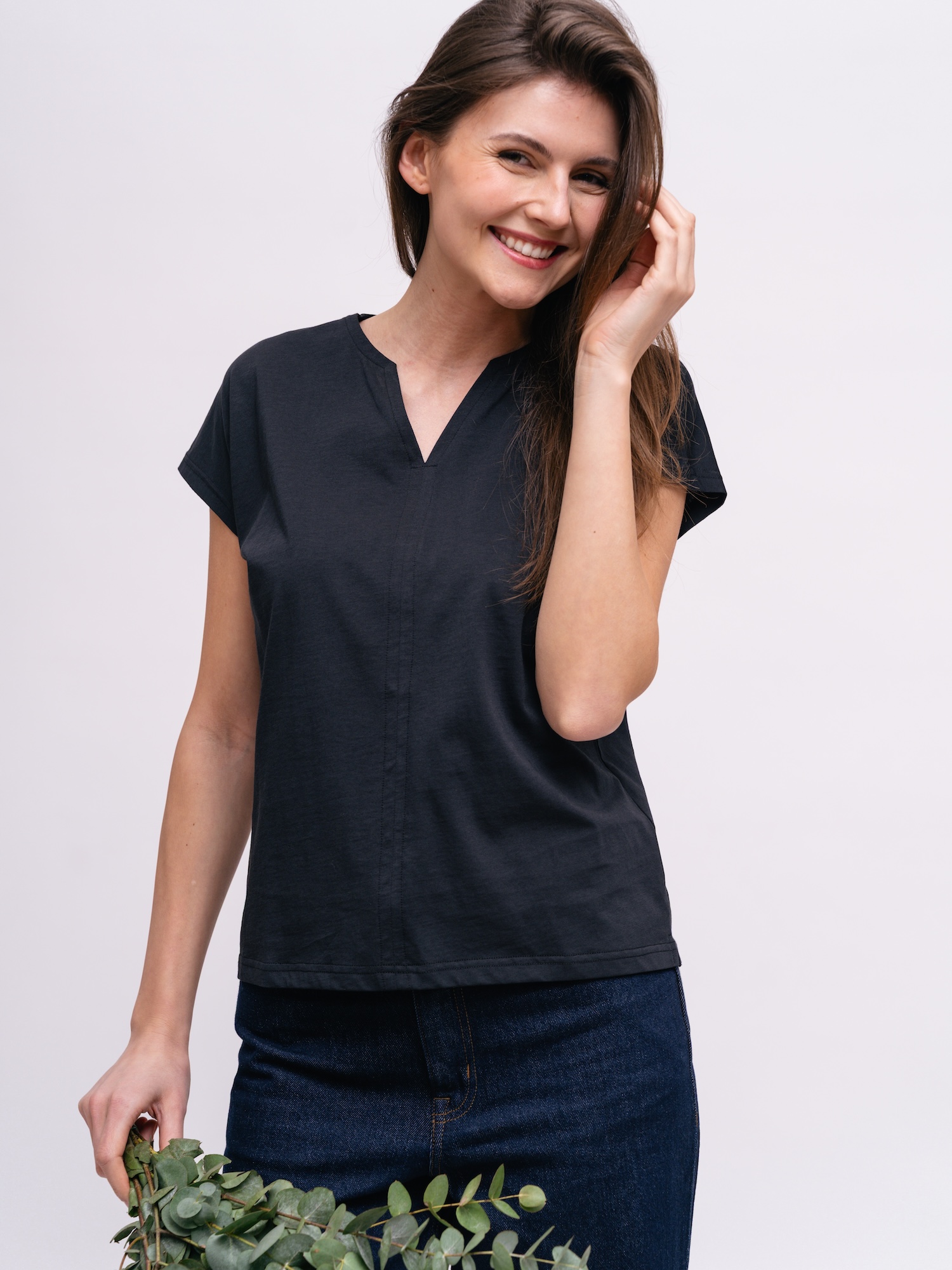 Čierny top s nenápadným výstrihom stojí na jednoduchom štýle. Skvelý na vrstvenie aj na minimalistické večerné outfity.